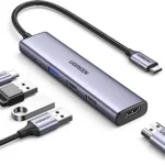 Multiport adapter with HDMI, USB 3.0, and SD card reader.